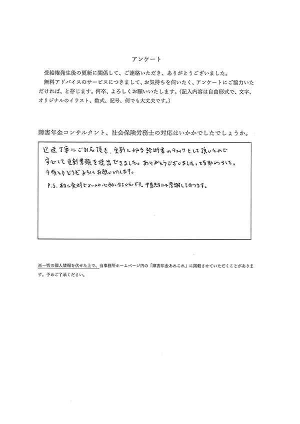 神奈川県にお住まいの統合失調感情障害を治療されているお客様の更新時無料アドバイス後の声(障害厚生年金2級で受給権発生)