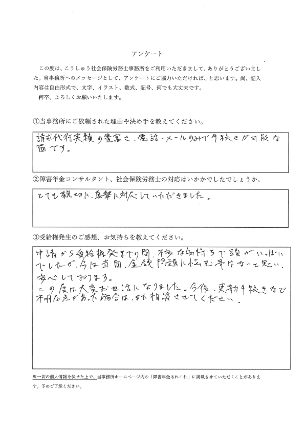 申請から受給権発生までの間、不安な気持ちで頭がいっぱいでしたが、今は当面、金銭問題に悩む事はないと思い、安心しております。