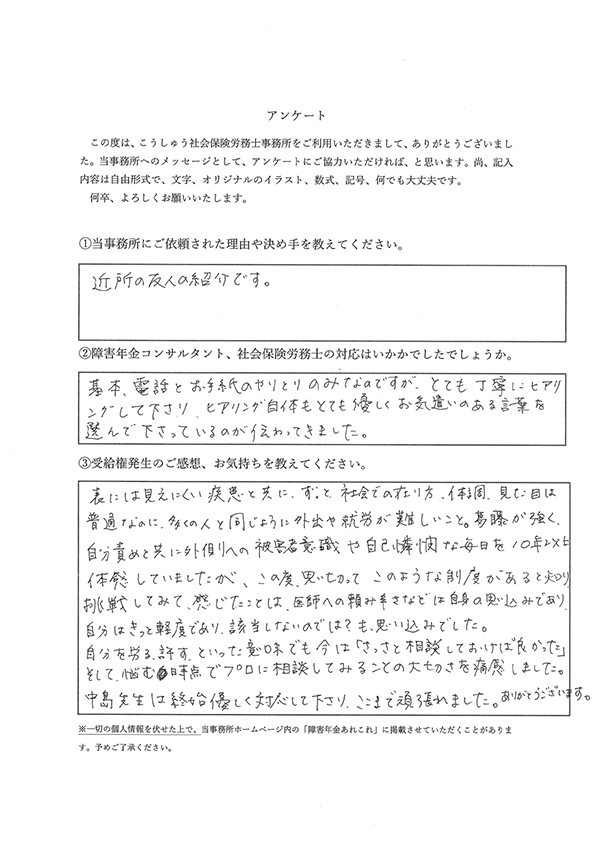 埼玉県にお住まいのうつ病を治療されているお客様の声(障害基礎年金2級で受給権発生)